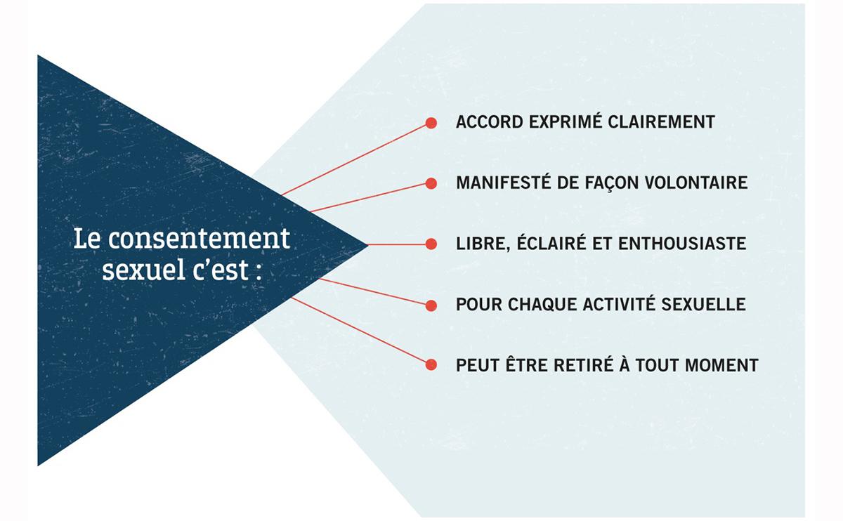 De plus, la loi exige qu’une personne prenne toutes les mesures raisonnables pour s’assurer du consentement de son-sa partenaire. Selon le Code criminel, il n’y a pas de consentement réel de la part de la victime lorsque celle-ci consent dans les circonstances suivantes : sous l’effet de la crainte; par suite de l’utilisation de la force, de menaces ou de fraude; par suite de l’exercice d’autorité. Pour plus d’information sur le cadre légal:
